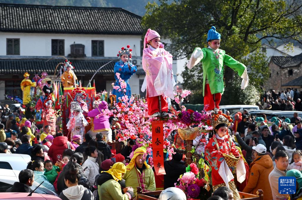 2月10日,浙江省武義縣俞源古村舉行“擎臺閣”迎元宵大型民俗展演活動(dòng),童男童女扮演的戲曲人物在村中巡游。