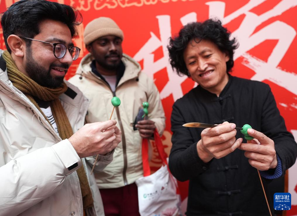 2月11日,在遼寧沈陽馬路灣街道,外國朋友獲贈(zèng)糖人禮物。