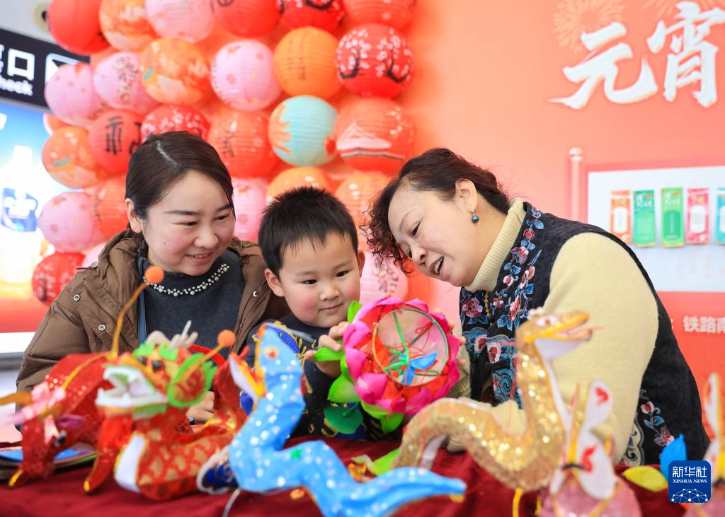 2月11日,旅客在南京南站舉辦的迎接元宵節(jié)活動(dòng)上體驗(yàn)制作花燈。