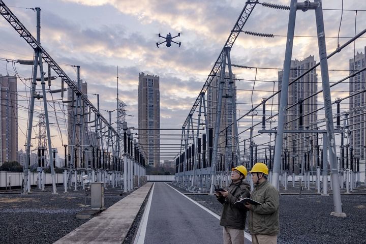 2月17日,國網泰州供電公司運維人員在220千伏寺巷變電站利用無人機巡檢電力設備。新華社發(湯德宏 攝)