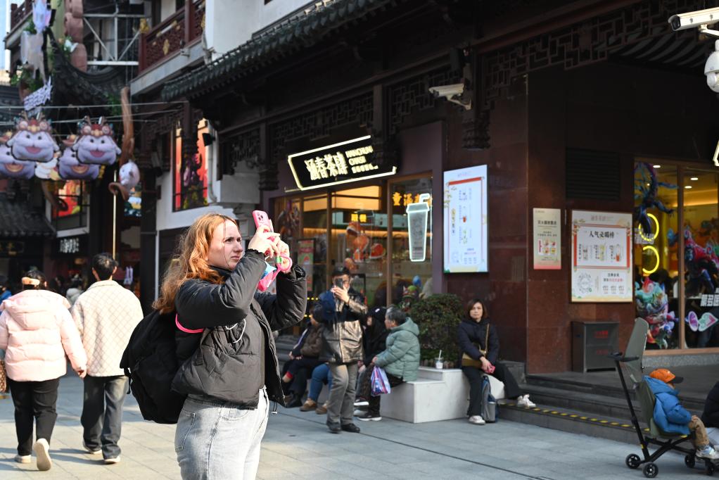 2025年1月21日,一名烏克蘭游客在上海豫園商圈觀光拍照。新華社記者 陳愛平 攝