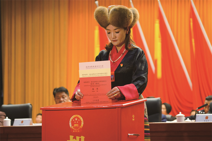 在拉薩市兩會上,人大代表投下神圣的一票,行使當家作主的權(quán)利。趙振宇 攝