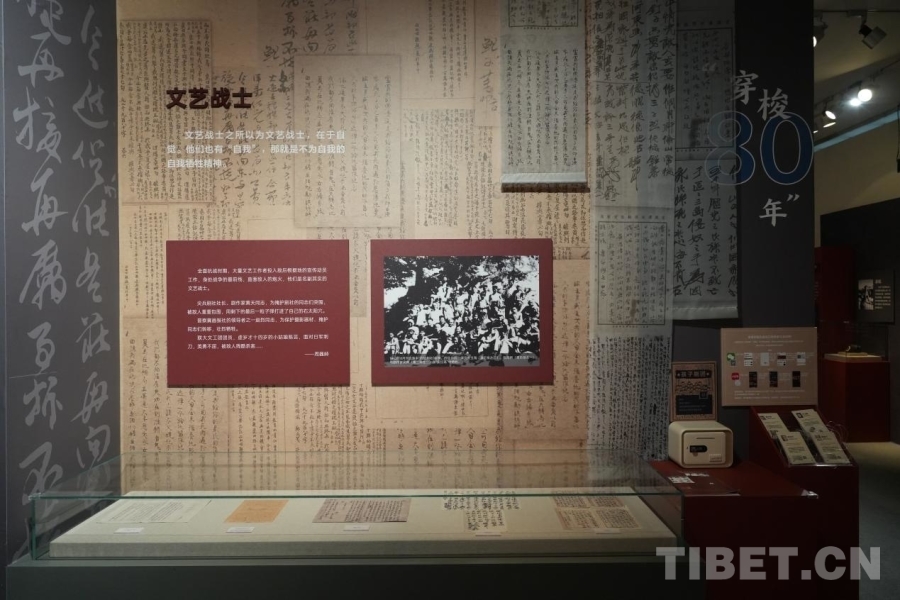 圖為中國現代文學館內,“山河跡憶——手稿里的抗戰中國”展覽中“文藝戰士”展示墻 攝影:郭睿佳