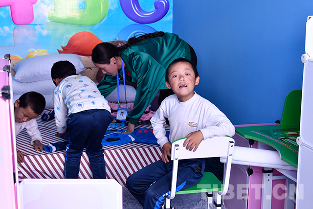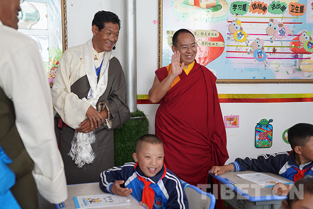 “喜歡這份工作嗎?”“愿意做這份工作嗎?”在康復區參觀調研時,十一世班禪仔細詢問老師們的工作情況并對他們說:“你們在這里為這些殘障的孩子奉獻,很了不起,向你們致敬。”