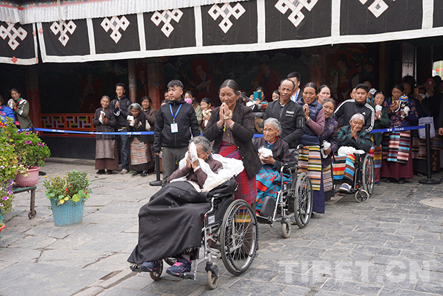 禮佛活動結束后,十一世班禪登上設在杜康殿門前的法座,為信教群眾摸頂賜福。此時,寺院外的廣場上,信教群眾已從四面八方趕來。隊伍里,有拄著拐杖的老人,有坐著輪椅來的老人,還有被年輕人背來的老人。