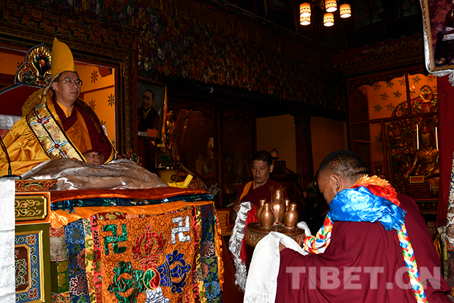 十一世班禪頭戴金色佛冠,由手持香炷的僧人引領,緩緩步入杜康大殿。在僧人們渾厚的誦經聲中,十一世班禪登上法座,領誦經文。寺廟僧人向十一世班禪敬獻曼扎等,十一世班禪微笑接過后,為僧人摸頂賜福,并發放布施、供齋茶齋飯。隨后,十一世班禪朝拜珍珠唐卡殿。