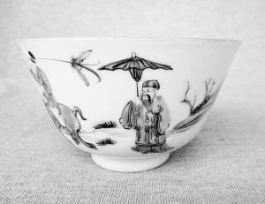 在茶盅底部,有大清光緒年制的底款,看來正制作于該時期。光緒年間,正是我國最后一個封建王朝清朝的黃昏之旅,國家內憂外患,官員自保不暇,百姓人人自危,似在走向窮途末路。制作茶盅的匠人,大概也希望能像畫面中的老者一樣,回鄉隱居,在山間林舍終老一生。但對于受官府管控的皇家官窯工匠來說,這樣的愿望,無異是一種可望而不即的奢望。