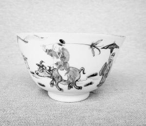 這只茶盅口徑10.5厘米,底徑4.3厘米,高8.7厘米,為粉彩瓷。茶盅表面繪有圖案,正是古人的清明踏青出游。只見群山隱約,山色朦朧,遠處氤氳一片,似乎在下著蒙蒙細雨。畫面中心位置,有一個古代裝束的老者正在緩緩前行,他笑呵呵地舉著傘,望著前面的孩童。孩童騎在一頭灰牛背上,左手拿著韁繩,右手扯著風箏線,任由風箏飛在天上。在他們的不遠處,有一處高大院落,層層臺閣;樹木無葉,枝條傾斜著伸向天空,就像一雙雙能夠托起太陽的手掌。在院落門前,有木條扎成的籬笆;籬笆旁邊,有兩塊圓滾滾的大石頭;石頭后面,有一棵杏樹,正燦然地開著滿樹的花朵,粉嫩粉嫩的,和青條綠葉相映成趣。