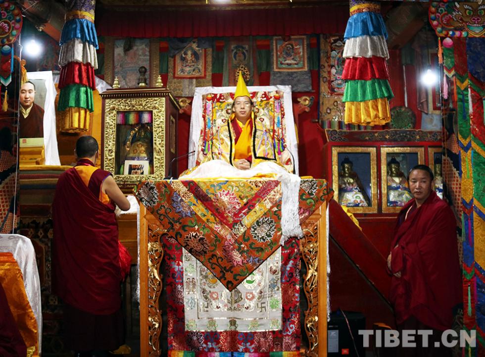此次,十一世班禪大師抵達塔爾寺后,首先前往大金瓦殿朝拜宗喀巴大銀塔,并進行誦經祈福活動。大金瓦殿,位于全寺正中,殿內供奉著標志宗喀巴誕生地的12.5米高大銀塔,塔爾寺即依此塔建立。大銀塔以純銀作底座,鍍以黃金,并鑲嵌各種珠寶。塔上有一龕,內塑有宗喀巴像,塔前陳放有各式酥油燈盞,銀鼓號角,玉爐金幢。十一世班禪大師坐在面對銀塔的法座上,莊嚴肅穆地誦經祈福。在一陣陣有韻律的誦經聲中,供奉在塔前的酥油燈光映照在班禪大師的臉上,塔爾寺大銀塔代表的有關格魯派和歷代班禪大師的輝煌歷史也似乎一幕幕地閃過,讓所有了解這段歷史的人,都不由地感慨萬千、激動不已。