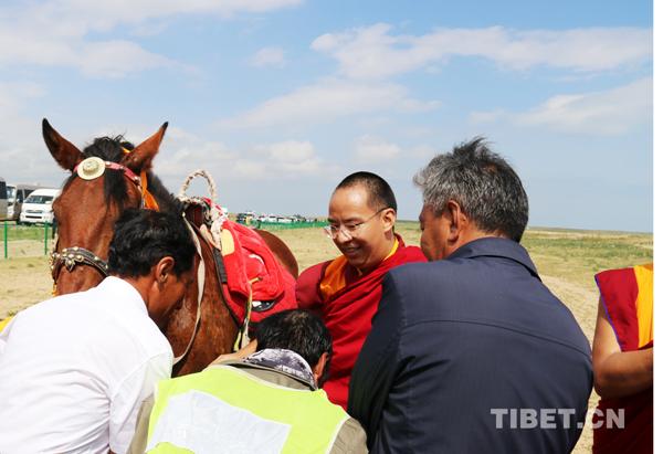 祭海儀式結束后,十一世班禪一行環湖游覽,在湖邊見到牧民斗改杰一家正牽著馬迎候。他們希望瞻禮到大師的尊容,為自己帶來福運。十一世班禪一時興起,想要騎騎他們的馬。斗改杰一家平時在青海湖二郎劍景區經營旅游騎馬項目,沒想到今天這樣幸運,十一世班禪騎著他們的馬,在青海湖邊七月鮮花盛開的草原上,瀟灑地馳騁了幾個來回。他們激動地都說不出話了。