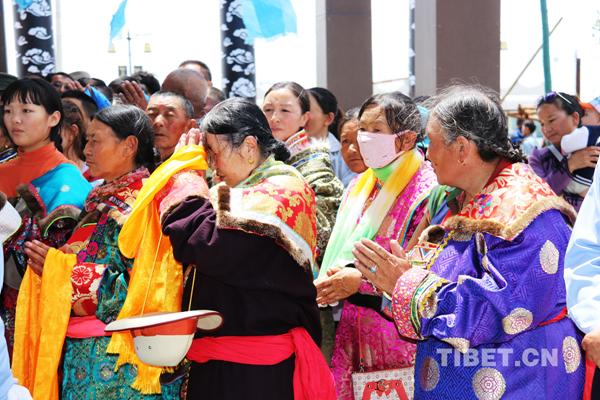 海西州的蒙古族藏族信眾們身著節日盛裝早早迎候在潔白的鹽湖旁,草原夏日的微風吹過,藍色的哈達、經幡和錦緞盛裝隨風舞動。看到十一世班禪到來,人們興奮地高呼“烏拉!烏拉!”這是用來表示歡迎和興奮的歡呼聲,眾人一起高呼,響徹云霄。十一世班禪為這些海西州的蒙藏信教群眾一一摩頂祈福。(中國西藏網 文、圖/噶哇扎西)