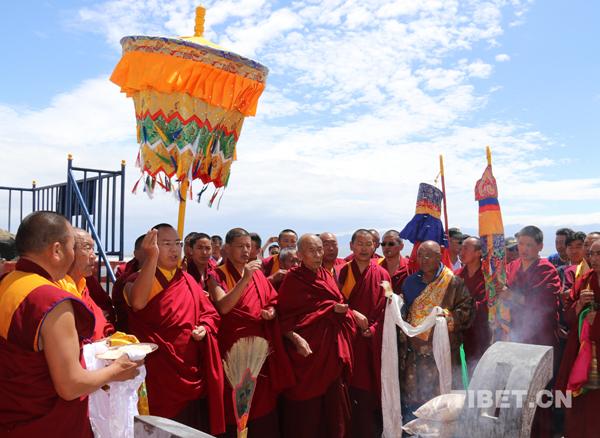 十一世班禪在茶卡鹽湖邊的敖包前誦經祈福。