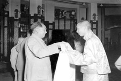 圖為十世班禪向毛澤東主席敬獻哈達。1954年,十世班禪受到毛主席等國家領導人的親切接見。他敬獻給毛主席的珍貴禮品表達了熱愛祖國大家庭、擁護黨的民族政策和人民領袖的心情。圖片來源:中國西藏之聲網