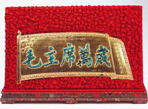 圖為金盾:毛主席萬歲。1951年5月,十世班禪大師敬獻毛澤東主席的禮品。金盾主體部分的五星紅旗是銅質鍍金,珍珠鑲嵌旗面周圍,綠松石鑲嵌字體,右側藏文為“班禪額爾德尼敬獻”。圖片來源:民族文化宮 許娜攝