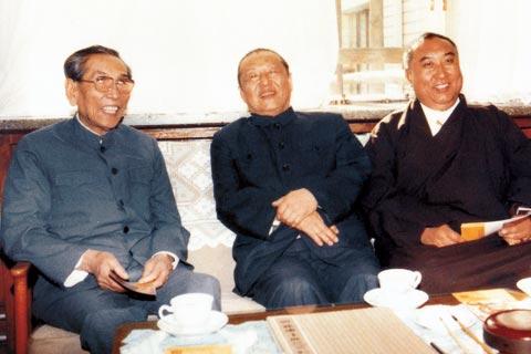 圖為1986年4月,習仲勛(中)與十世班禪(右)、阿沛o阿旺晉美(左)在一起。圖片來源:新華網
