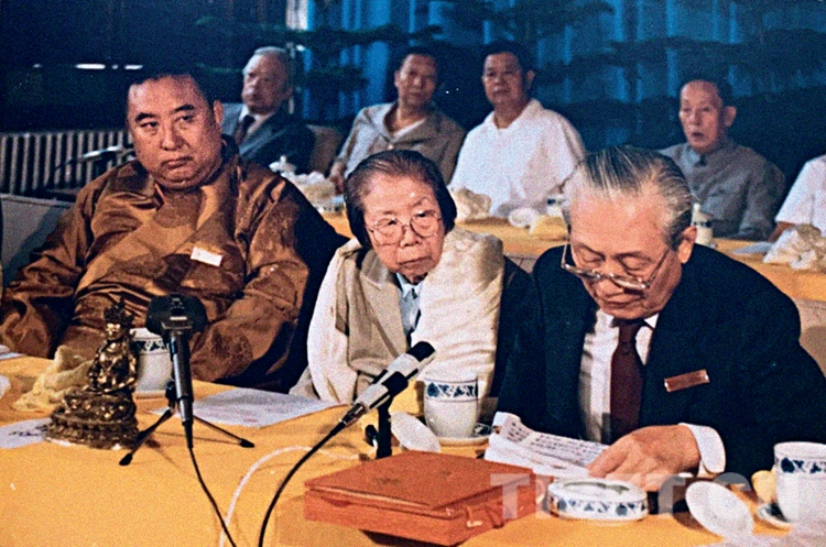 十世班禪和趙樸初顧問在中國藏語系高級佛學院成立儀式新聞發布會上接受媒體采訪。中國藏語系高級佛學院提供