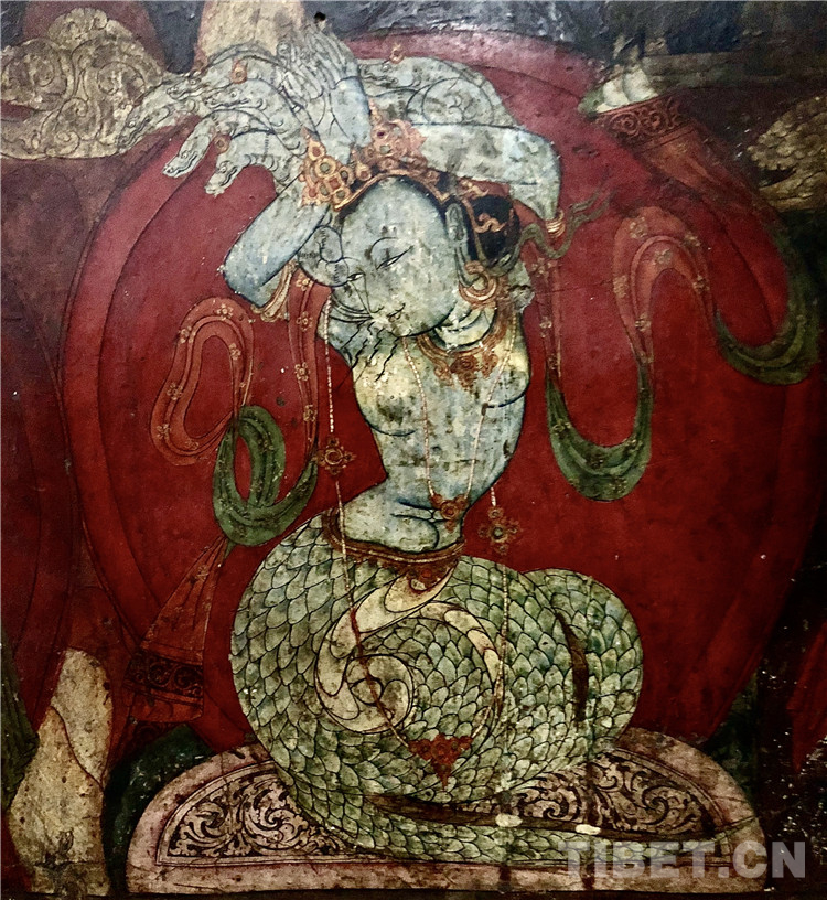 追溯其源頭,在阿里的巖畫中曾經有不少龍神崇拜的母題,苯教經典《十萬龍經》亦有記載龍母創生萬物的神話。所以,有學者將這類人獸結合的龍女形象,看作是苯教母題下古格造像藝術的產物。