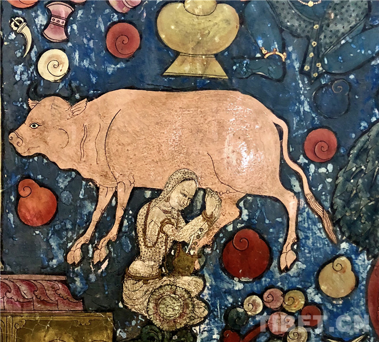 對于世俗生活的紀實性記錄,是古格時期壁畫的一大貢獻。生活場景、器物大量出現在托林寺壁畫中,圖中擠奶女子的神情很專注,牛也安靜得好似在享受。乳汁從女子兩肘之間流入她身前的罐子里。人和動物的比例都很精準,在大面積深色的背景上,畫家選用了淺色來描繪這個畫面,使得這微小的細節非常醒目。牧業一直是阿里地區的主要產業,擠奶、制作奶制品是當地每位藏族婦女都會的家務。在自由創作的區域,壁畫創作者很自然地將這日常勞作描繪出來。但是,女子的服飾是印度風格,牛也不是青藏高原特有的牦牛,說明了當時古格藝術對外域文化的開放性。