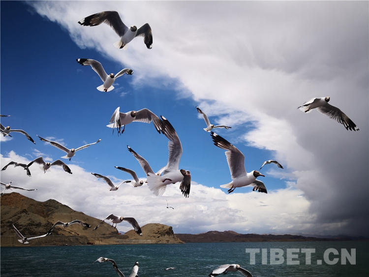 7月26日,十一世班禪觀覽班公湖,考察生態(tài)保護情況。置身于藍天綠水和湖光山色中,觀看鳥兒展翅飛翔和低空盤旋,聆聽美妙的鳥鳴聲,讓人感受到人與自然、與動物和諧相處的溫馨場景。