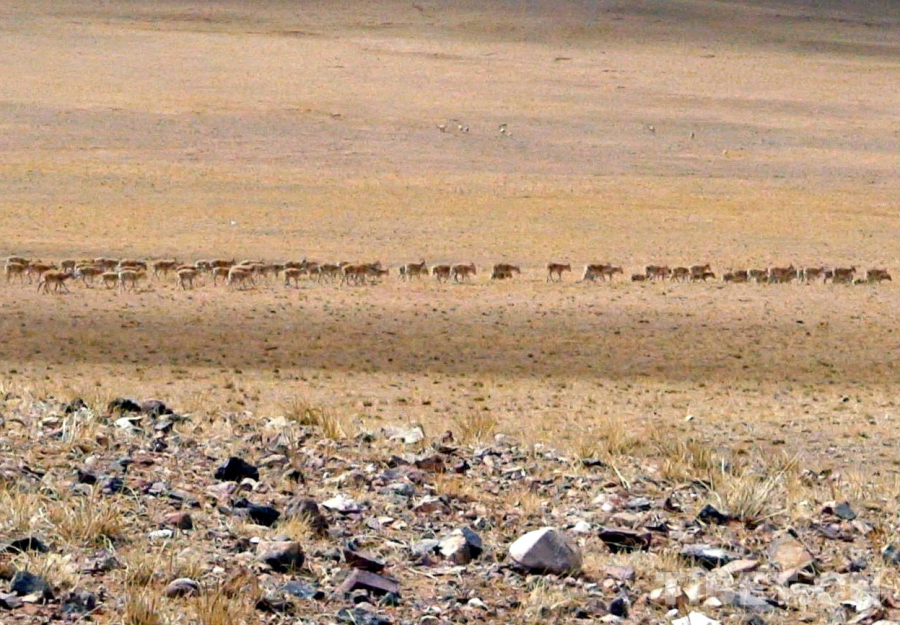 圖為羌塘國家級自然保護區正在遷徙產羔的成群藏羚羊(唐召明2006年攝)