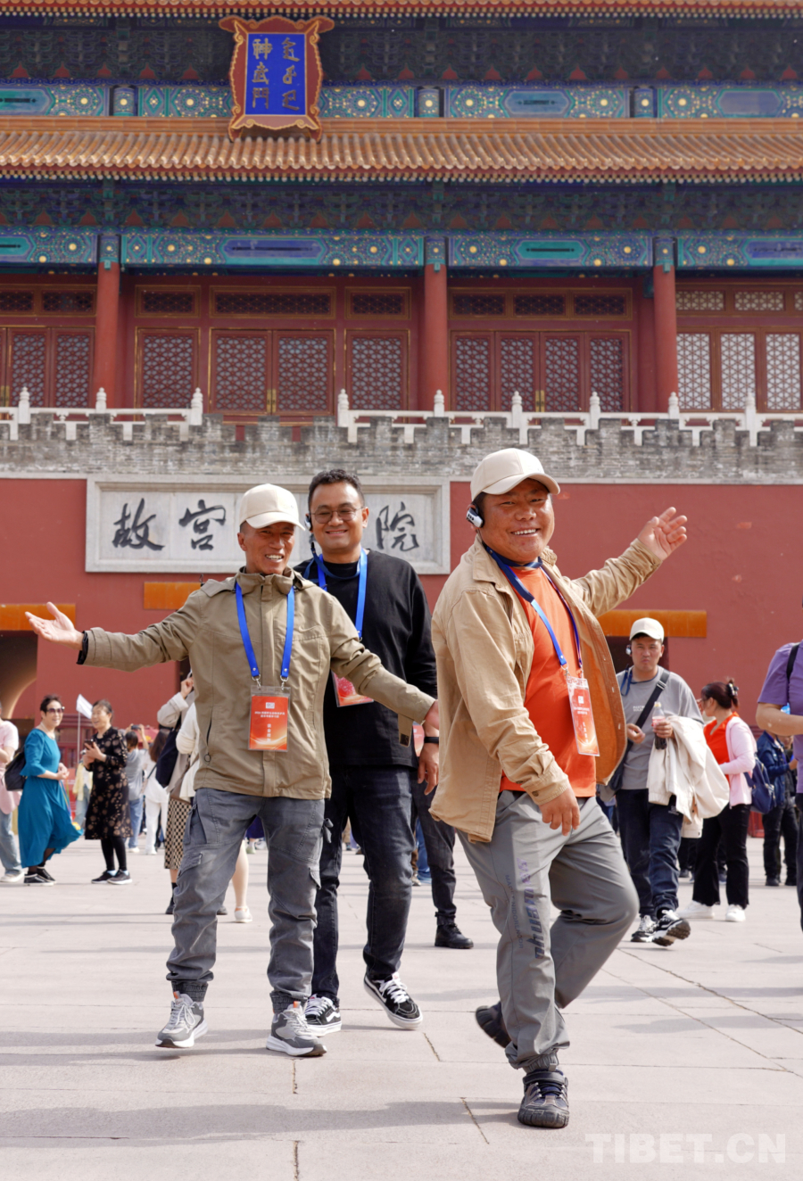 圖為羌塘國家級自然保護區尼瑪縣羅布玉杰管理站野保員扎西索朗(右一)在北京故宮博物院參觀時,情不自禁地跳起鍋莊舞(王麒龍2024年4月25日攝)