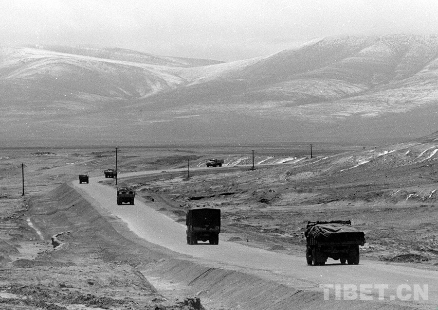 汽車車隊行駛在茫茫的唐古拉山區段(唐召明1987年攝)