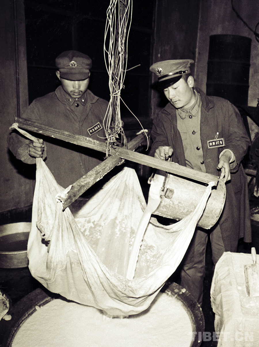五道梁兵站戰士正在制作豆腐。在風雪青藏公路線上,它豐富了過往人員就餐的“菜盤子”(唐召明1987年攝)