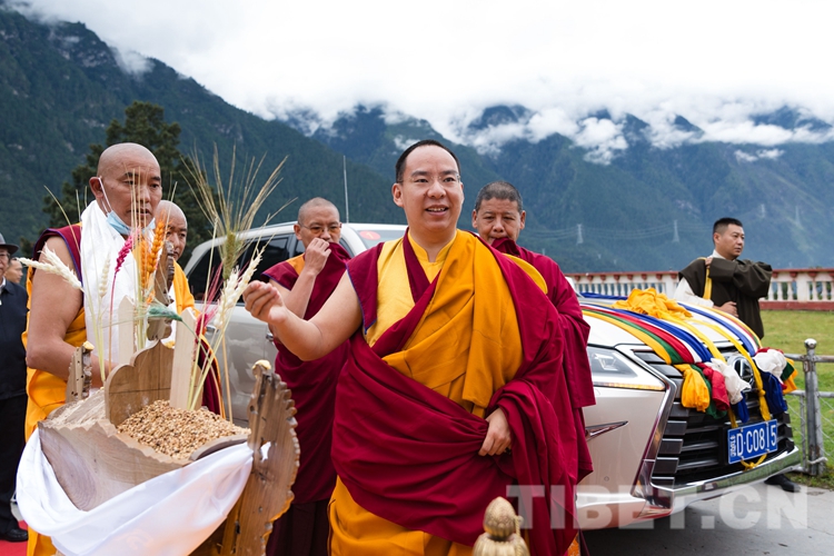 9月2日,山間云霧還未散去,寺院僧人早已整齊列隊(duì),高舉幡幢,手持香爐、法號,恭迎全國政協(xié)常委、中國佛教協(xié)會副會長、中國佛教協(xié)會西藏分會會長班禪額爾德尼o確吉杰布的到來。