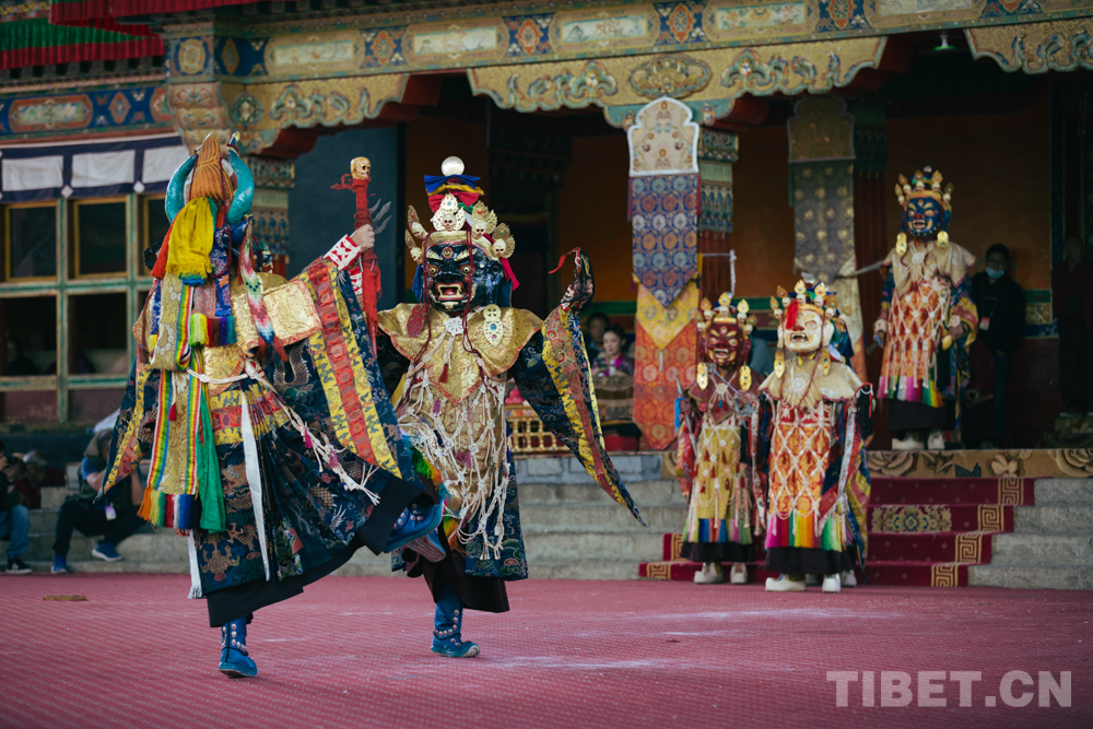 “跳神”有嚴格的程序,舞蹈節奏緩慢,為了活躍場面,在每節之間,有兩名穿藏裝的“波”和“莫”(即老頭和老太),他們隨時出場,相互以啞劇式表演來表達內容,模仿各種人物的滑稽動作,引得十一世班禪時不時地會心一笑。