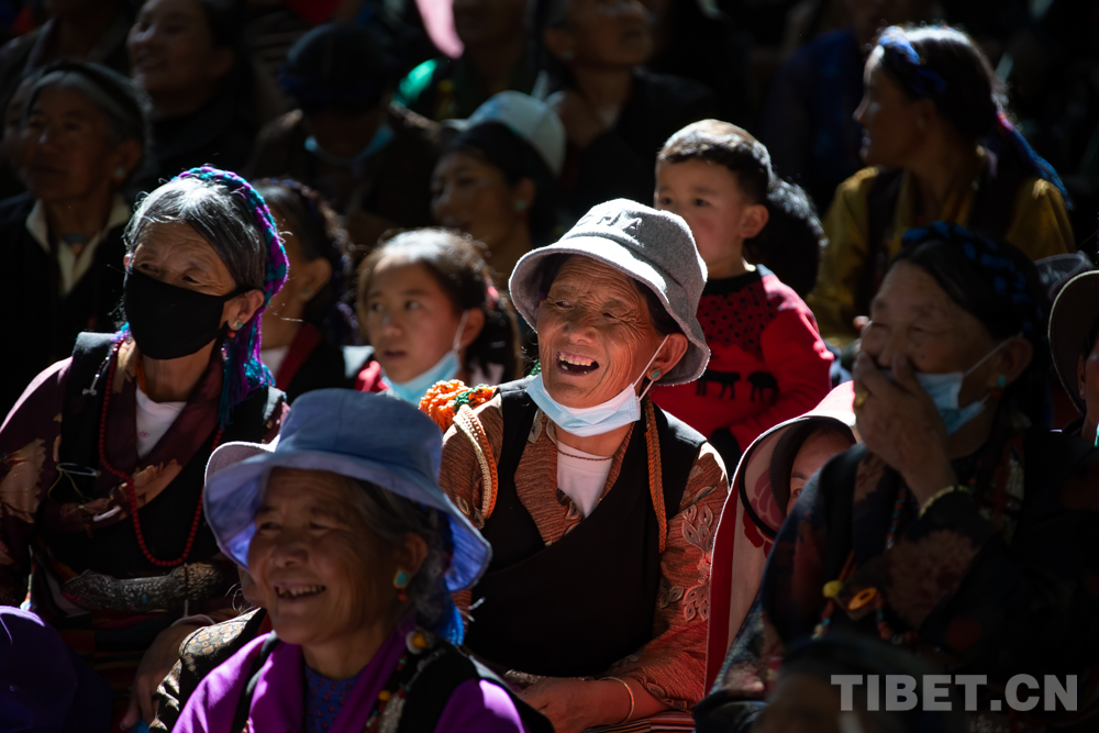 偌大的空地上早早坐滿了前來觀看“跳神”表演的僧俗信眾,身著傳統藏裝的他們早早趕來,只為“搶占”有利位置朝拜十一世班禪、觀看“跳神”。上午10時許,“跳神”儀式正式開始。