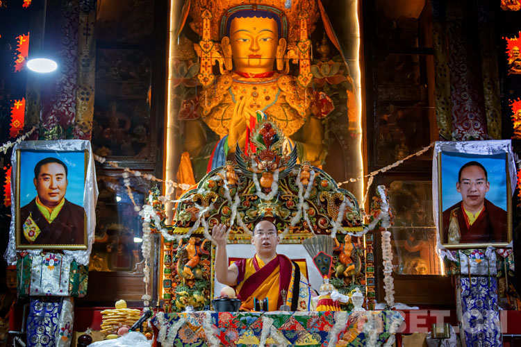 圖為十一世班禪在日喀則市亞東縣吉汝寺展佛臺前為展佛唐卡開光 攝影:鄭朔