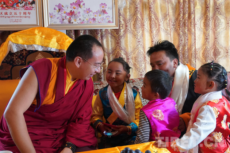 圖為十一世班禪在林芝市米林縣西噶門巴村與村民貢桑及其子女親切交談 攝影:王淑
