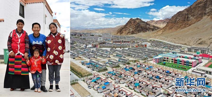 拼版照片:左圖為西藏阿里地區日土縣東汝鄉阿汝村村民丹木真(中)和妻子扎西拉姆(左)、女兒南嘎曲增(右)、小女兒列旺桑姆在噶爾縣康樂新居易地扶貧搬遷安置點;右圖為噶爾縣康樂新居易地扶貧搬遷安置點一角(無人機照片)。2018年,丹木真和家人搬遷到噶爾縣康樂新居易地扶貧搬遷安置點,告別了村里土木結構的舊房子,住進了150平方米的新居。安置點內醫務室、幼兒園、活動中心等設施齊全,和丹木真一家一樣,從阿里地區改則縣、措勤縣、革吉縣等地搬遷來的2000多名群眾在這里過上了安居樂業的幸福生活(7月25日攝)。 新華社記者 詹彥 攝