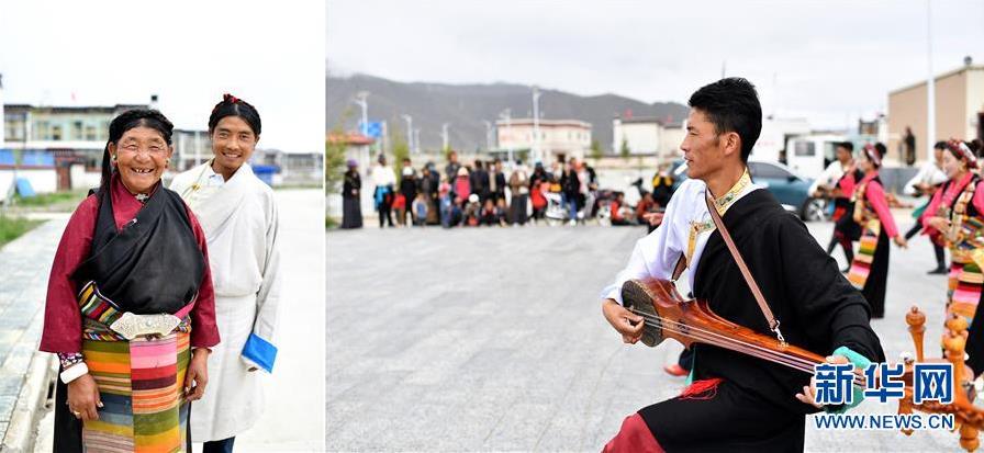 拼版照片:左圖為西藏日喀則市拉孜縣查務鄉明瑪村村民倉瓊(左)和兒子群培次仁;右圖為拉孜縣民間藝術團在明瑪村易地搬遷點為村民表演。明瑪村舊村交通不便,資源匱乏,自然環境惡劣,發展和脫貧受到制約。2016年,當地政府經多次規劃研究,在征求村民意見后,確定將明瑪村整村搬遷。2016年10月,倉瓊和家人搬遷到了明瑪村新村。新村交通便利,文化休閑廣場、活動室、學校等基礎設施完善。倉瓊和家人商量后,在新村開了一家小商店,一年有1萬多元的收入,再加上村里養殖專業合作社的分紅,倉瓊一家的日子越來越好(8月2日攝)。 新華社記者 詹彥 攝