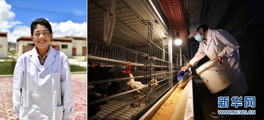拼版照片:左圖為西藏日喀則市拉孜縣曲下鎮吉如村村民卓嘎;右圖為卓嘎在拉孜縣拉貴藏雞養殖孵化保種基地里忙碌。2020年年初,卓嘎來到拉貴藏雞養殖孵化保種基地工作,很快就學會了藏雞的養殖技術,在這里工作,卓嘎每個月能拿到4000多元的工資(8月1日攝)。 新華社記者 詹彥 攝