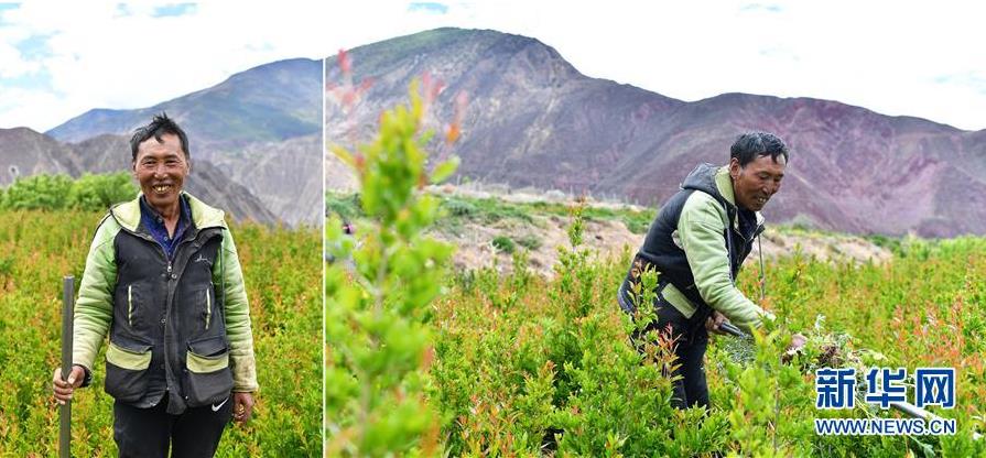 拼版照片:左圖為西藏昌都市芒康縣納西民族鄉加達村村民土登曲培;右圖為土登曲培在芒康縣納西民族鄉三江農民專業合作社的苗圃里忙碌。幾年前,土登曲培來到三江農民專業合作社打工,負責種樹和喂牛,每月有3000多元的收入(5月4日攝)。 新華社記者 詹彥 攝