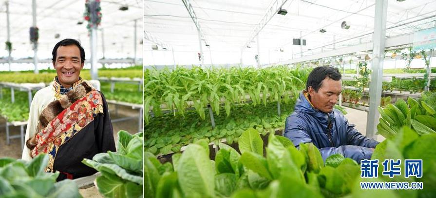 拼版照片:左圖為西藏阿里地區噶爾縣左左鄉上左左村村民宿加在噶爾縣生態農業產業園;右圖為宿加在噶爾縣生態農業產業園查看蔬菜生長情況。2017年,宿加來到噶爾縣生態農業產業園打工,學習蔬菜種植技術。如今,宿加已成為噶爾縣生態農業產業園的一把好手,每個月有6000元的收入(7月25日攝)。 新華社記者 詹彥 攝