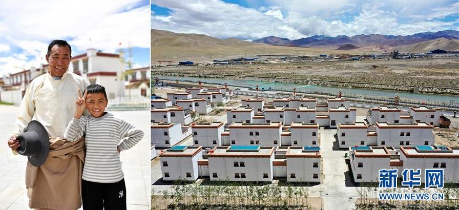 拼版照片:左圖為西藏阿里地區改則縣物瑪鄉村民頓珠多吉(左)和孫子曲達在噶爾縣康樂新居易地扶貧搬遷安置點;右圖為噶爾縣康樂新居易地扶貧搬遷安置點一角(無人機照片)。2017年,頓珠多吉一家從改則縣物瑪鄉搬遷到噶爾縣康樂新居易地扶貧搬遷安置點,住進了100平方米的新居。在安置點,和頓珠多吉一家一樣,從阿里地區改則縣、措勤縣、革吉縣等地搬遷來的2000多名群眾開啟了更加美好的生活(7月25日攝)。 新華社記者 詹彥 攝