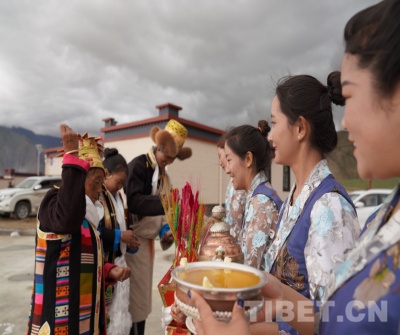 圖為瓊結(jié)鎮(zhèn)扶貧干部自發(fā)組織向搬遷群眾敬獻青稞酒。攝影:曲杰