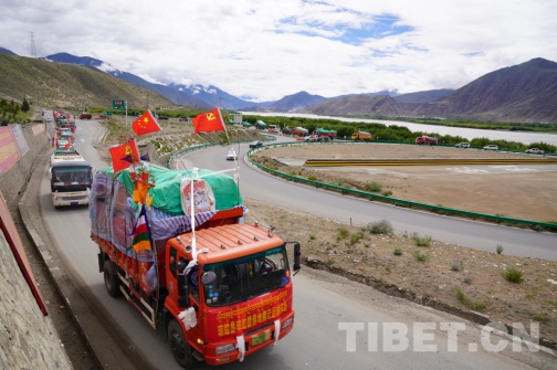 7月10日9時30分,國家重點文物保護單位——松贊干布陵區(qū)前,懸掛著“瓊結(jié)鎮(zhèn)易地搬遷運輸車隊”的39輛車整齊列隊, 20戶78名搬遷戶身著節(jié)日的盛裝,坐著滿載著搬遷群眾幸福和希望的運輸車隊浩浩蕩蕩地從瓊結(jié)縣出發(fā),前往山南市乃東區(qū)多頗章鄉(xiāng)嘎東團結(jié)新村搬遷點。