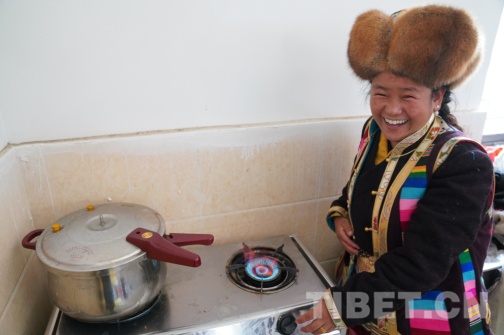 圖為在多頗章鄉(xiāng)嘎東團結(jié)新村搬遷點,瓊結(jié)鎮(zhèn)雪康社區(qū)搬遷戶索朗玉珍做飯第一次用上了煤氣灶。攝影:曲杰