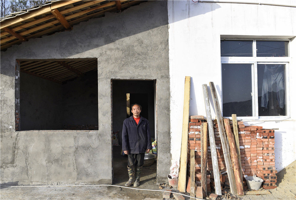 四川巴中市南江縣小田村村民秦發章在他正在修建的新房前留影(2018年3月20日攝)。新華社記者 劉坤 攝