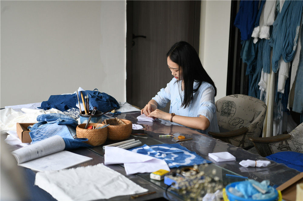 在四川省德陽市旌陽區高槐村扎染工作室,一名扎染愛好者在學習扎染技藝(6月14日攝)。新華社記者 王曦 攝