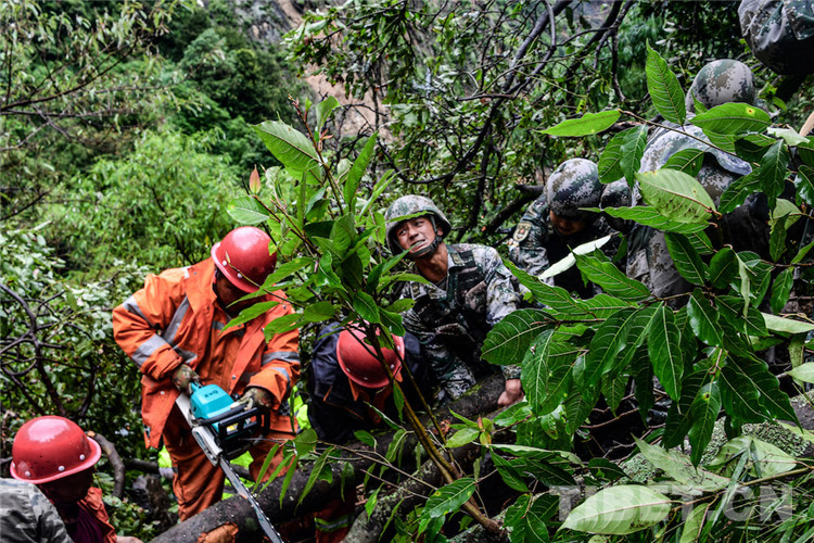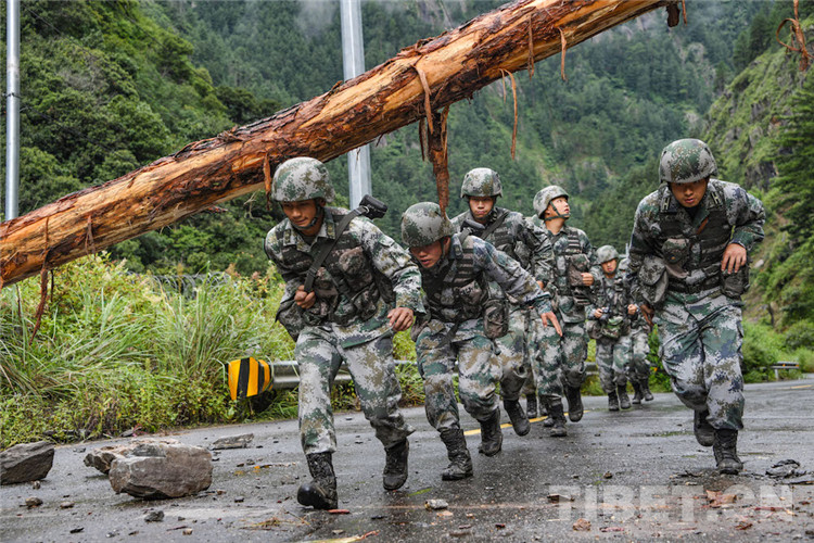 “山體滑坡帶下來的亂石和粗大的樹干擋住了去路,塌方面積不大,現在挖掘機正在作業,跟當地人員溝通,他們說預計下午能搶通。” 巴桑爬上塌方的亂石堆觀察后,跑回來跟帶隊的副營長張為鵬報告情況。