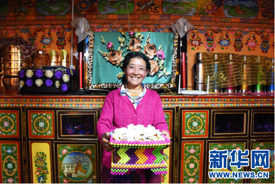 崗巴縣群眾端著糖果盒迎接遠到的客人(9月15日攝)。新華網 張宸 攝