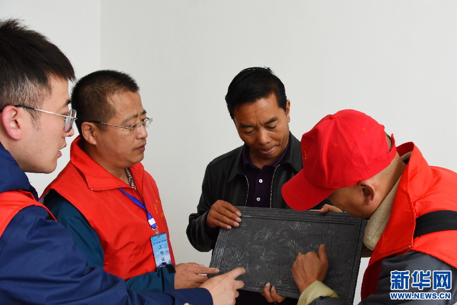 康馬縣縣長扎西多布拉給前來參觀的網絡正能量人士介紹工藝品(9月16日攝)。新華網 張宸攝