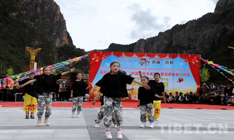 圖為昌都市崗托鎮小學生在豐收節表演舞蹈