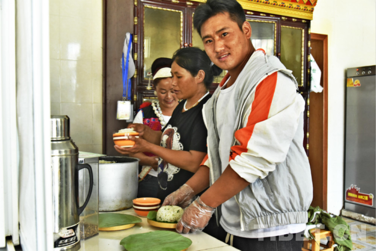 綠色芭蕉葉鋪在竹編的盤子里,輔以雞肉、野菜、辣椒以及當地特色的米酒佐餐,一時間,寬敞的飯廳里寂靜無言,大家只顧埋頭品嘗美食。