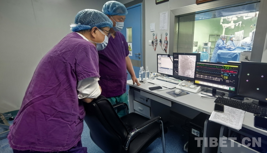 圖為陰赪茜(手術(shù)室內(nèi)右)趕赴阿壩州人民醫(yī)院手術(shù)救治急性心梗患者,屏幕上顯示出陰赪茜正操作纖細(xì)的導(dǎo)絲嘗試通過患者發(fā)生閉塞的心臟血管 攝影:劉莉