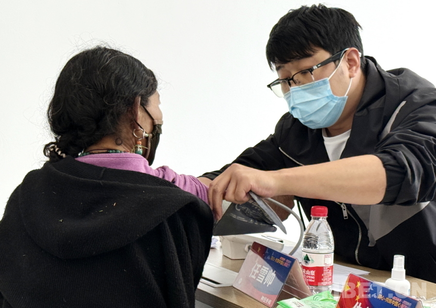 圖為火箭軍特色醫學中心神經外科醫生任雪帥正在為就醫群眾測量血壓 攝影:喇應強